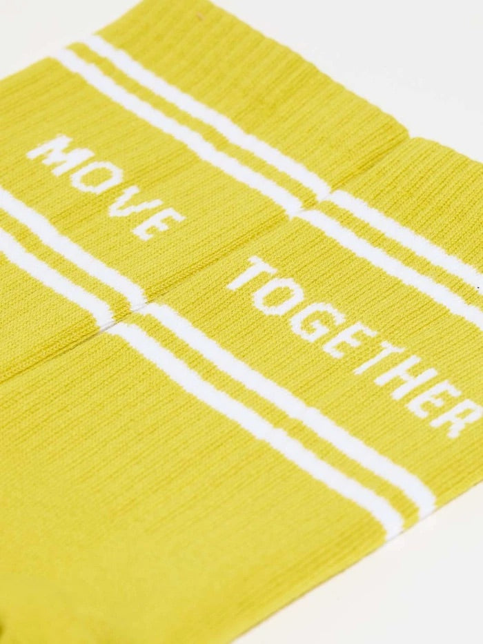 - MOVE TOGETHER steht eingerahmt zwischen Konstraststreifen über der Ferse.